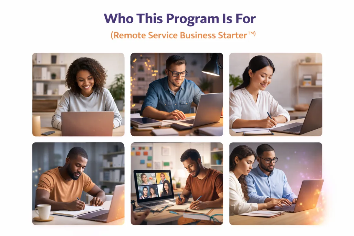 The Remote Service Business Starter™ is a guided, cohort-based program designed to help you launch a real remote service business with structure, systems, and clarity.